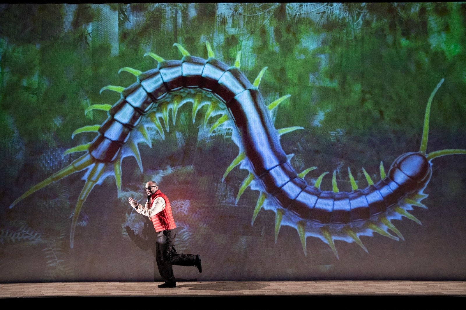 Sedikit demi sedikit, mesin terbawa suasana berkat aktor yang berganti tempat, kacamata, dan kostum dengan kecepatan penuh untuk melipatgandakan karakter, dengan efek “teknologi rendah” yang menyenangkan: capung raksasa bergerak di depan latar belakang hijau untuk membuat kita percaya bahwa kita berada di hutan Amazon atau boneka bangau yang menabrak papan.