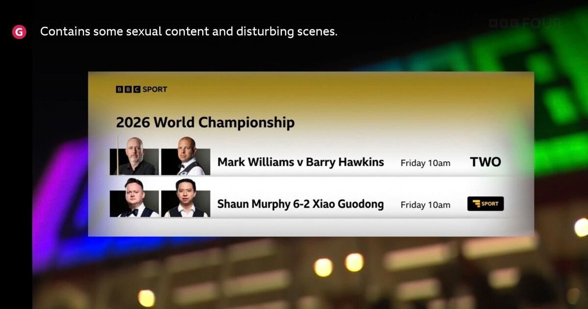 Namun, bukan hanya pertunjukan bergengsi di baize yang menarik perhatian para penggemar yang menonton di seluruh dunia. Mark Williams menghadapi Barry Hawkins pada sesi pagi hari Jumat, sementara Shaun Murphy kembali beraksi melawan Xiao Guodong. Namun saat siaran BBC dimulai, sebuah pesan aneh di bagian atas layar berbunyi: “Berisi beberapa konten seksual dan adegan yang mengganggu.”