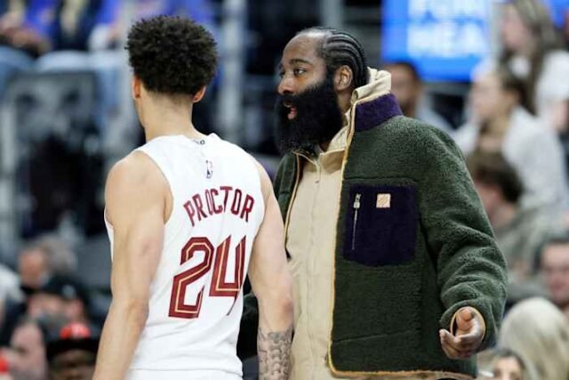 Guard Cleveland Cavaliers James Harden, kanan, yang absen karena cedera patah ibu jari kanan, berbicara dengan guard Cavaliers Tyrese Proctor (24) pada paruh pertama pertandingan bola basket NBA Detroit Pistons, Jumat, 27 Februari 2026, di Detroit. (Foto AP/Duane Burleson)