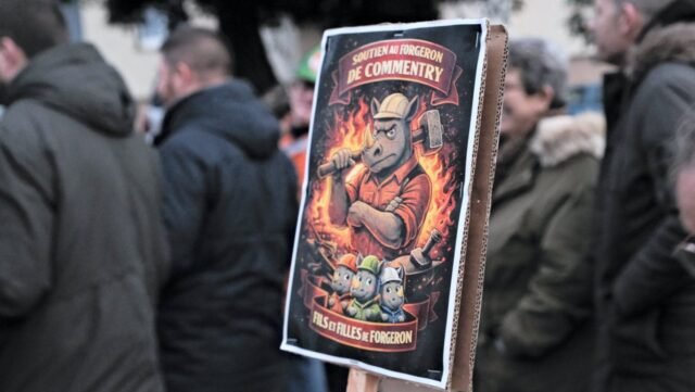 Jadi ketika pengumuman penutupan pabrik baja, yang sekarang dimiliki oleh Erasteel, dan penghapusan 190 pekerjaan, seluruh penduduk Commentry dimobilisasi untuk memprotes kegagalan industri ini. Hal ini diwujudkan dengan terpal besar yang menutupi gerbang tua seperti kain kafan…
