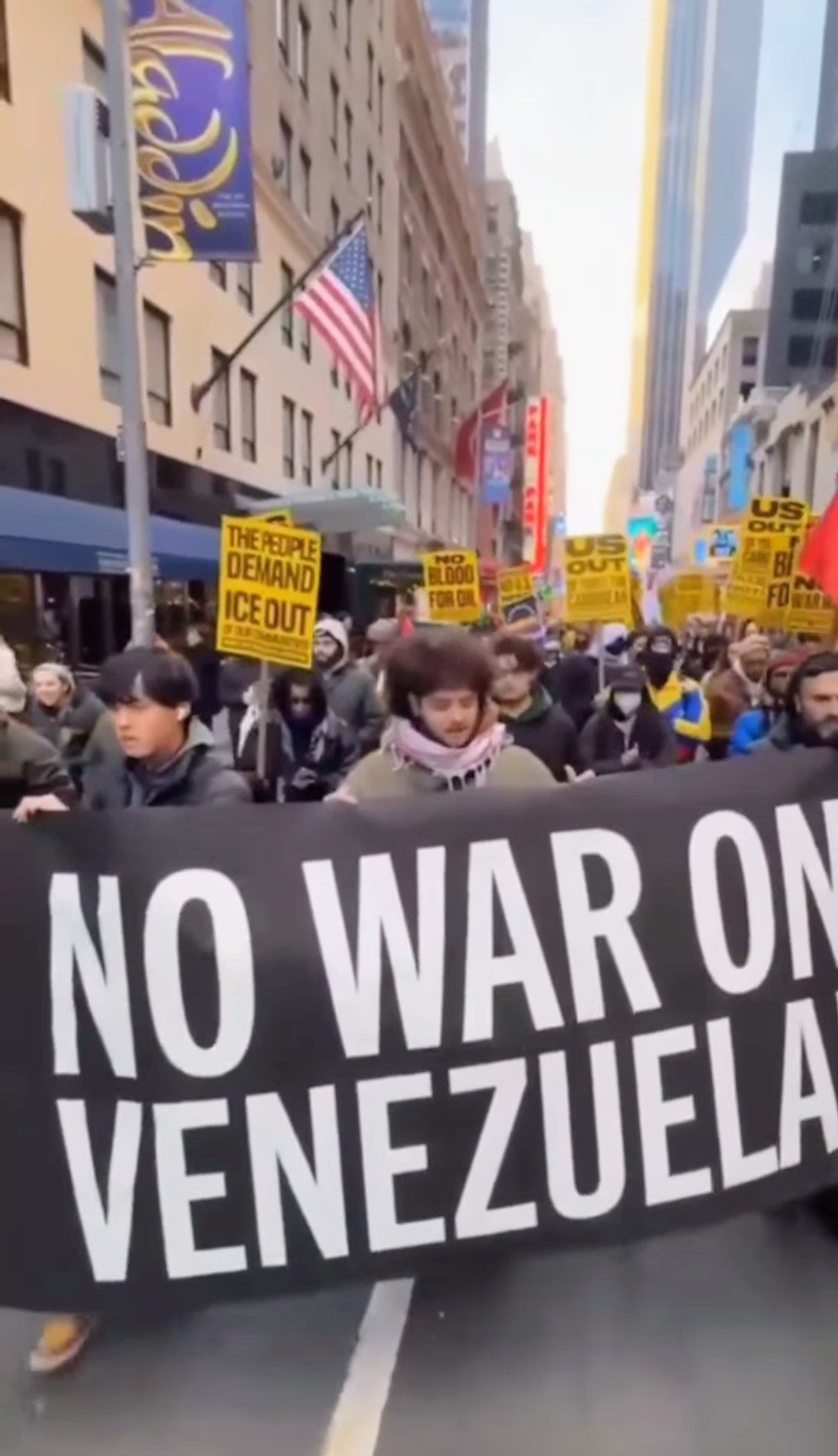 Orang Amerika terbangun pada hari Sabtu tanggal 3 Januari di negara yang sedang berperang. Hal itulah yang disadari banyak orang setelah Donald Trump mengumumkan bahwa pasukan AS telah mengebom ibu kota Venezuela, Caracas, dan menangkap Presiden Nicolás Maduro. Jadi, meskipun tenggat waktu singkat dan suhu sangat dingin, beberapa ratus orang berkumpul di Times Square, di depan bendera Amerika yang terang benderang di pusat perekrutan Angkatan Darat AS untuk memprotes tindakan agresi terbaru Amerika Serikat…