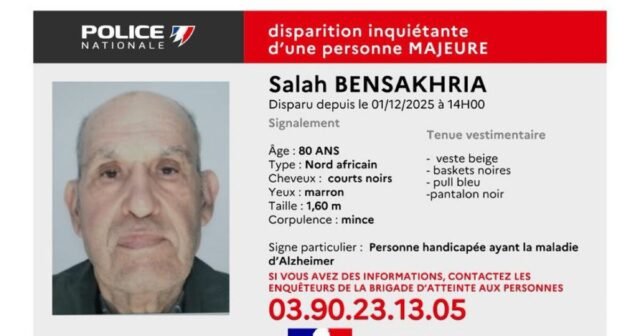 Polisi nasional meminta saksi setelah hilangnya seorang pria berusia 80 tahun yang mengkhawatirkan. Menderita penyakit Alzheimer, ia terakhir terlihat pada 1 Desember 2025 pukul 14.00 di kawasan Hoenheim.