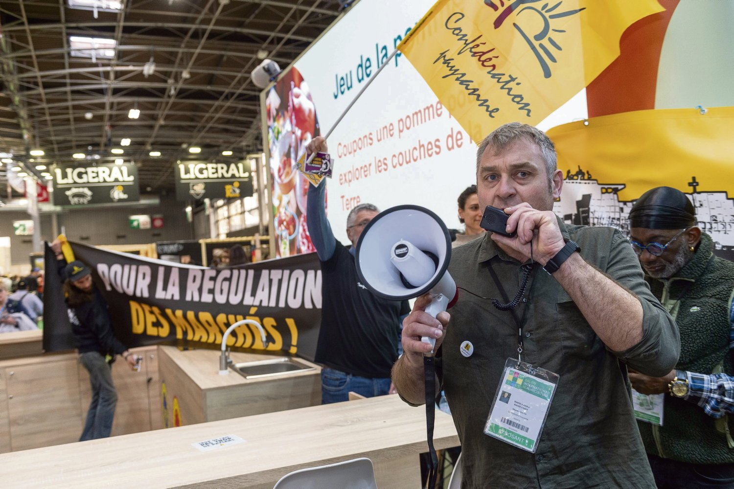 Di tengah-tengah babi Limousin yang berpantat hitam dan babi lainnya, tiba-tiba awan bendera kuning berkibar. Pada hari Rabu, di Pameran Pertanian, para aktivis dari Konfédération Paysanne secara mengejutkan menyerbu stand Uni Eropa (UE), di bawah tatapan penasaran para pengunjung yang datang untuk mengagumi hewan ternak. “Ada satu orang besar yang hilang dari Pameran Pertanian ini, yaitu pertanyaan tentang pendapatan petani », tegas juru bicara serikat pekerja, Stéphane Galais, melalui megafon.