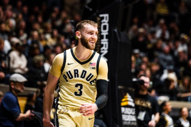 Daniel Jacobsen, Gicarri Harris dan Fletcher Loyer terlihat di pertandingan Purdue Basketball versus Minnesota pada Rabu, 10 Desember 2025.