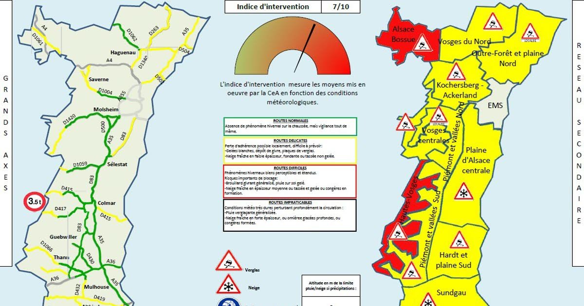 Kondisi lalu lintas di jaringan jalan raya dan jaringan utama Komunitas Eropa Alsace (CEA) normal hingga sulit karena adanya bongkahan es yang terlokalisasi.