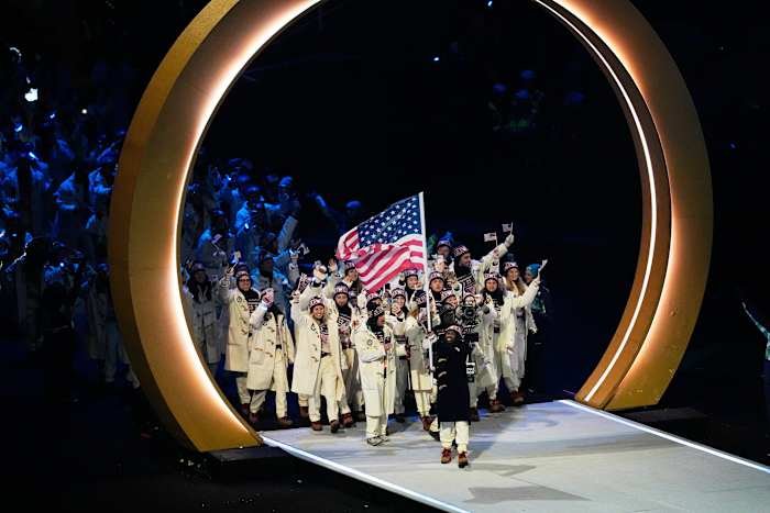 Dipimpin oleh speedskater dan pembawa bendera Erin Jackson, Tim AS termasuk di antara delegasi terakhir yang memasuki stadion San Siro Milan dalam parade negara pada hari Jumat.