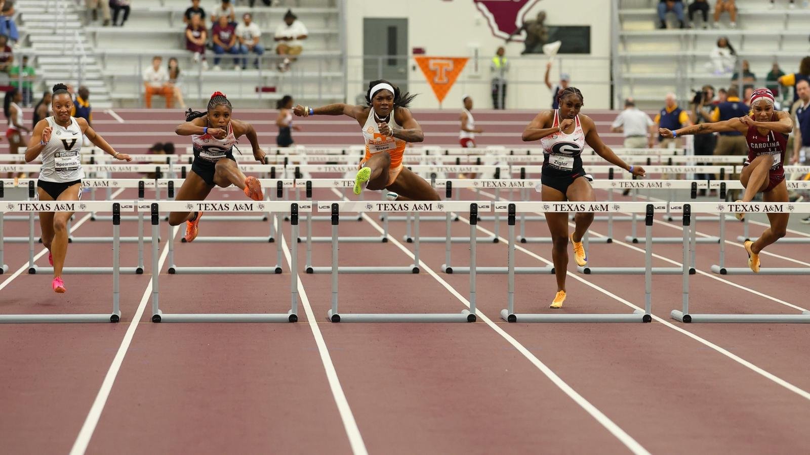 Tennessee melengkapi bagian putri pada aksi hari Jumat dengan dua penampilan menonjol dalam lari gawang 60 meter. Juara bertahan SEC Myreanna Bebe mencatat waktu terbaik musim 7,96 untuk mencapai final konferensi kedua berturut-turut, dan Skye Tolbert menghasilkan nilai terbaik pribadi 8,15 untuk naik ke peringkat 9 dalam sejarah sekolah.